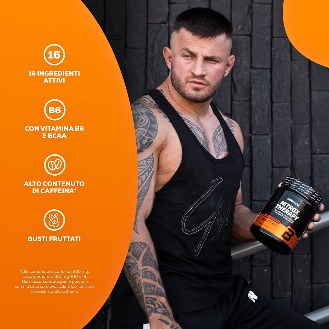 Nitrox Therapy è l’alleato ideale per lo sportivo che cerca un integratore pre-allenamento complesso e privo di zuccheri, per chi pratica fitness, sport di resistenza o da combattimento, per le persone che preferiscono i prodotti in polvere e per chiunque cerca una motivazione extra per l’allenamento.
