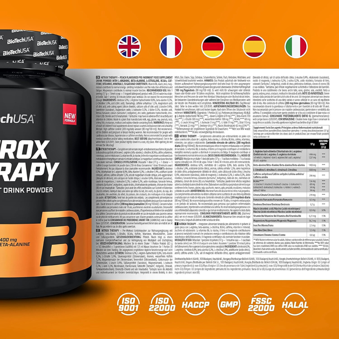 Nitrox Therapy è stato riformulato pensando ai consumatori e alle loro esigenze. La speciale composizione di questo integratore pre workout si basa su una formula contenente aminoacidi. Ogni porzione di Nitrox Therapy contiene 1.496 mg di Beta-Alanina, 459 mg di L-Citrullina, 1.496 mg di L-Arginina HCl, come anche calcio citrato malato e L-Arginina AKG.