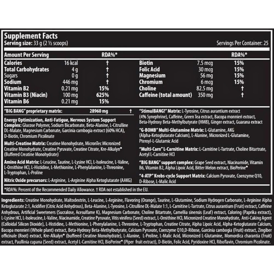 54 principi attivi in una formula complessa? Sì! BIG BANG 3.0 è un prodotto pre-allenamento molto forte e molto complesso che offre 54 ingredienti utili senza grandi quantità di carboidrati! Questo prodotto è stato accuratamente progettato per sostenere il vostro corpo durante l’attività fisica, in particolare durante allenamenti ad alta intensità. Il nostro complesso multi creatina fornisce 5 fonti di Creatina il più completo di sempre! Una dose di Creatina è scientificamente provato che incrementa le prestazioni fisiche in caso di attività ripetitive, di elevata intensità e di breve durata*.