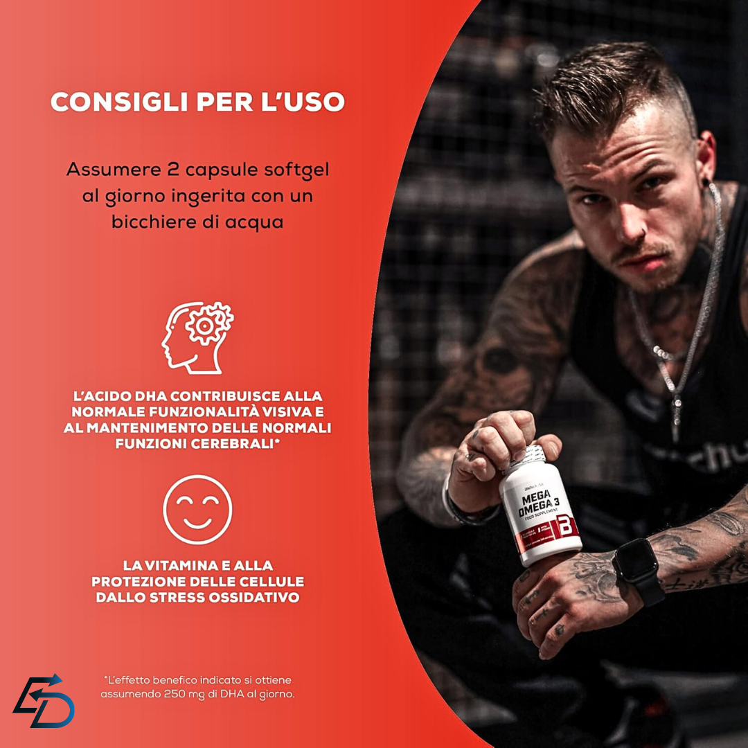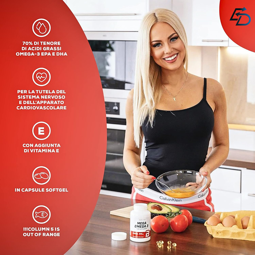 Mega Omega 3 con la sua formula in capsula softgel oltre all’elevata quantità del 70% di acidi grassi EPA (acido eicosapentaenoico) e DHA (acido docosaesaenoico) contiene anche la vitamina E.