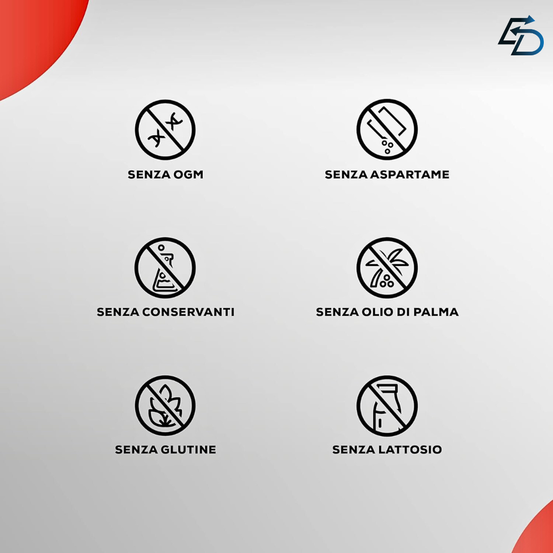Olio di Pesce 70% (di cui 40% EPA e 30% DHA), Involucro capsula (Gelatina, Umettante: Glicerina, Acqua purificata), DL-Alfa Tocoferolo (Vitamina E). Prodotto in uno stabilimento che lavora anche latte, uova, glutine, soia, crostacei, biossido di zolfo e frutta a guscio.