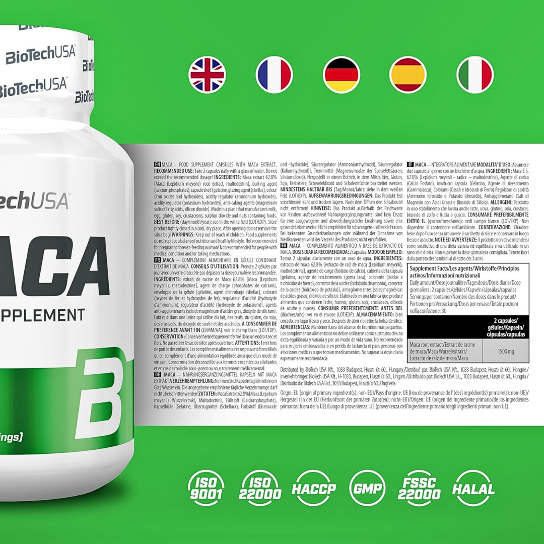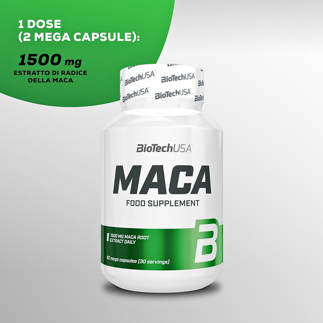Maca E.S. 62.8% (Lepidium meyenii - radice – maltodestrine), Agente di carica (Calcio Fosfato), involucro capsula [Gelatina, Agente di rivestimento (Gommalacca), Coloranti (Ossidi e Idrossidi di Ferro) Regolatori di acidità (Ammonio Idrossido e Potassio Idrossido), Antiagglomeranti (Sali di Magnesio con Acidi Grassi e Biossido di Silicio).