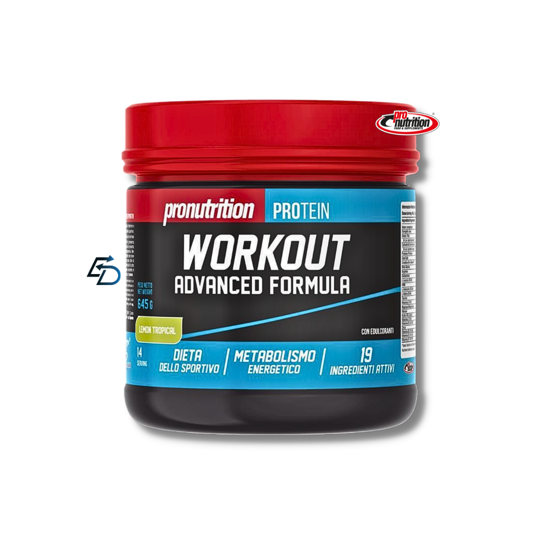 Prodotto senza compromessi nel quale potenza, energia e recupero si fondono insieme. WORKOUT contiene infatti ben 4 fonti di carboidrati (primo tra questi il Vitargo®), le migliori sostanze per il recupero (BCAA, HMB, Krealkalyn, miscele di Glutammine ed Arginine di ultima generazione, Beta Alanina, Taurina) ed un mix completo di vitamine, minerali e sostanze antiossidanti (Acido Lipoico, ribosio, mix vitaminico, zinco e magnesio). Il prodotto non contiene grassi. Il prodotto può essere consigliato sia prima, che durante o dopo la propria sessione di allenamento proprio per la sua completezza e versatilità. Pro Nutrition ha pensato a questo prodotto per favorire allenamenti più intensi, ridurre i tempi di recupero, favorire i processi di crescita muscolare e aumentare la forza. Il prodotto non contiene aspartame.