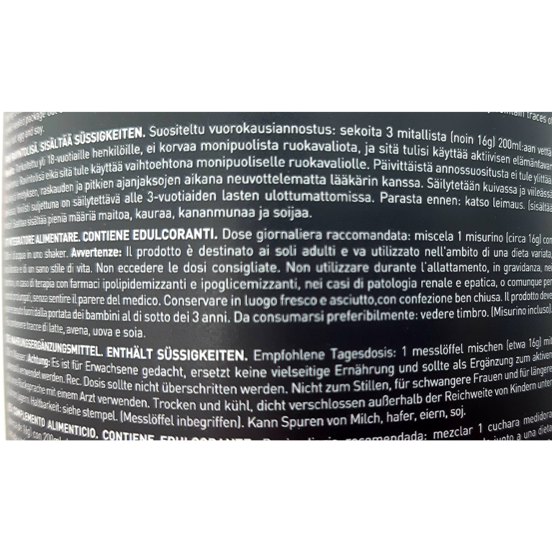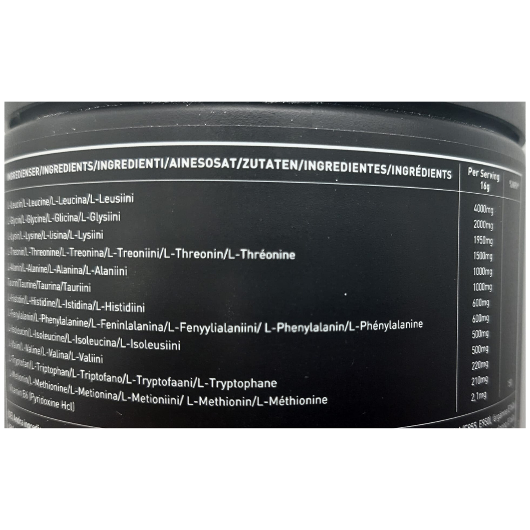 Ingredienti: L-leucina, l-isoleucina, l-valina, glicina, l-lisina, l-treonina, l-alanina, taurina, l-metionina, l-istidina, l-fenilalanina, l-triptofano, correttore di acidità (E330, E296), aromi, dolcificante (E953, E955, E950), colorante (E160a)