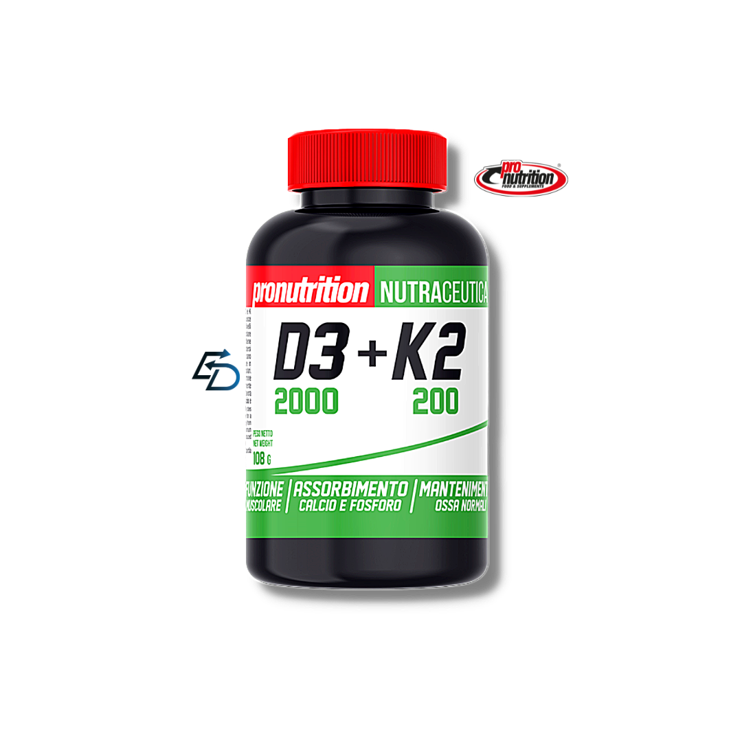 Integratore Alimentare a base di Vitamina D3 e K2. Le vitamine K2 e D3 utilizzate sono ottenute per fermentazione vegetale. La D3 da lichene islandico e la K2 è sotto forma di menachinone-7. Le vitamine D e K contribuiscono al mantenimento di ossa normali. La Vitamina D contribuisce al normale assorbimento/utilizzo del calcio e del fosforo ed a normali livelli di calcio nel sangue ed al mantenimento della normale funzione muscolare e normale funzione del sistema immunitario. Il prodotto non contiene naturalmente lattosio