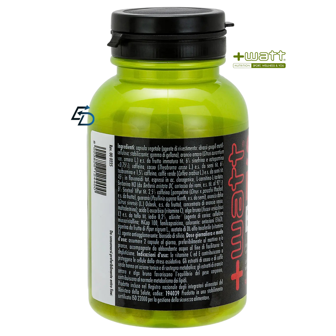 capsula vegetale (agente di rivestimento: idrossi-propil-metilcellulosa; stabilizzante: gomma di gellano), arancio amaro (Citrus aurantium var. amara L.) e.s. da frutto immaturo tit. 6% sinefrina e octopamina <0,75%), caffeina, cacao (Theobroma cacao L.) e.s. da semi tit. 6% teobromina e 1,5% caffeina, caffè verde (Coffea arabica L.) e.s. da semi tit. 45% in flavonoidi tot. espressi in ac. clorogenico, L-carnitina-L-tartrato, Berberina HCl (da Berberis aristata DC, corteccia dei rami, e.s. tit. al 97%), 8% Sinetrol®XPur tit. 2,5% caffeina [pompelmo (Citrus x paradisi Macfad, e.s. da frutto), guaranà (Paullinia cupana Kunth, e.s. da semi), arancio dolce (Citrus sinensis (L.) Osbeck, e.s. da frutto), concentrato di arancia rossa, maltodestrina]; acido L-ascorbico (vitamina C), alga bruna (Fucus vesiculosus L.) e.s. da tallo tit. iodio 0,2%, aXivite® (agente di carica: cellulosa microcristallina, HiCap 100, fenilcapsaicina, colorante: antociani E163), piperina da frutto di Piper nigrum L., acetato di DL-alfa-tocoferile (vitamina E), agente antiagglomerante: biossido di silicio.